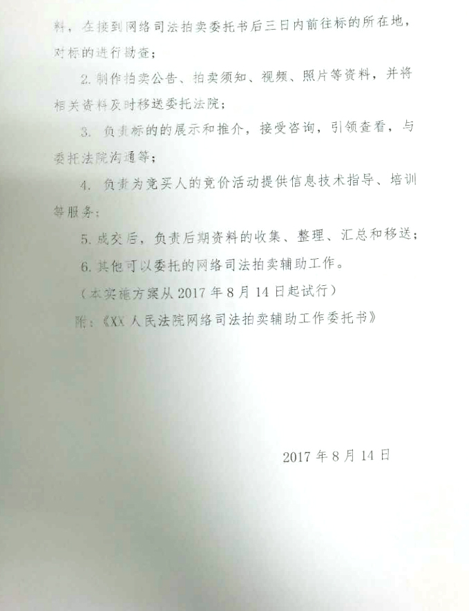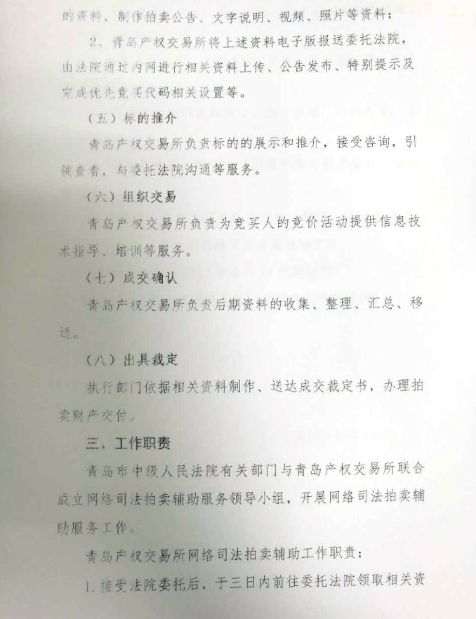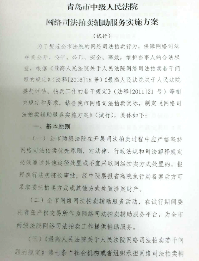為進(jìn)一步規(guī)范全市法院網(wǎng)絡(luò)司法拍賣行為,保障網(wǎng)絡(luò)司法拍賣公開、公平、公正、安全、高效,維護(hù)當(dāng)事人的合法權(quán)益,結(jié)合我市網(wǎng)絡(luò)司法拍賣實(shí)際,制定《青島市中級(jí)人民法院網(wǎng)絡(luò)司法拍賣輔助服務(wù)實(shí)施方案(試行)》,現(xiàn)將實(shí)施方案印發(fā)給你們,請(qǐng)認(rèn)真遵照?qǐng)?zhí)行。